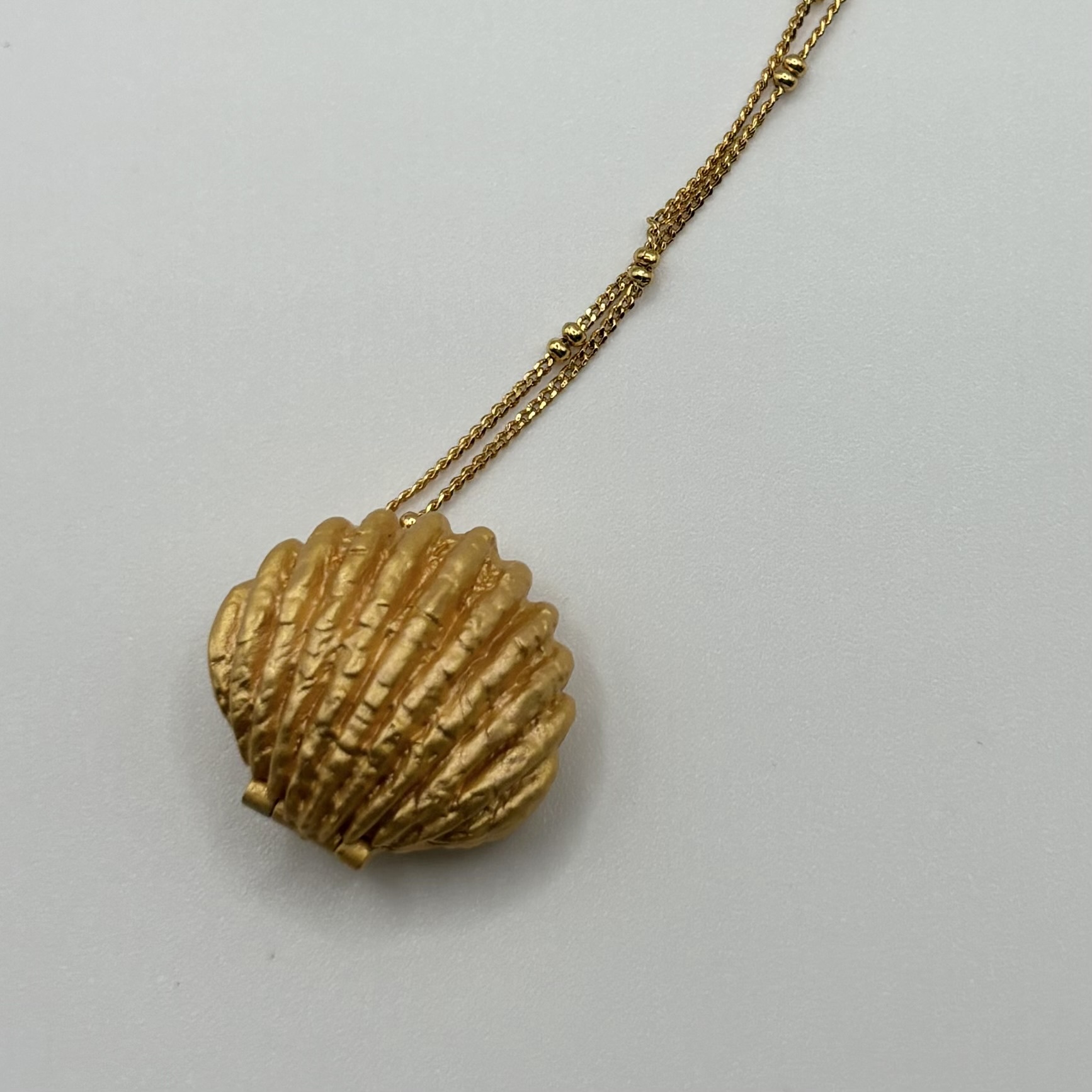 開閉できる貝殻とパールのネックレスは、優雅さと遊び心を兼ね備えた魅力的なアクセサリーです。