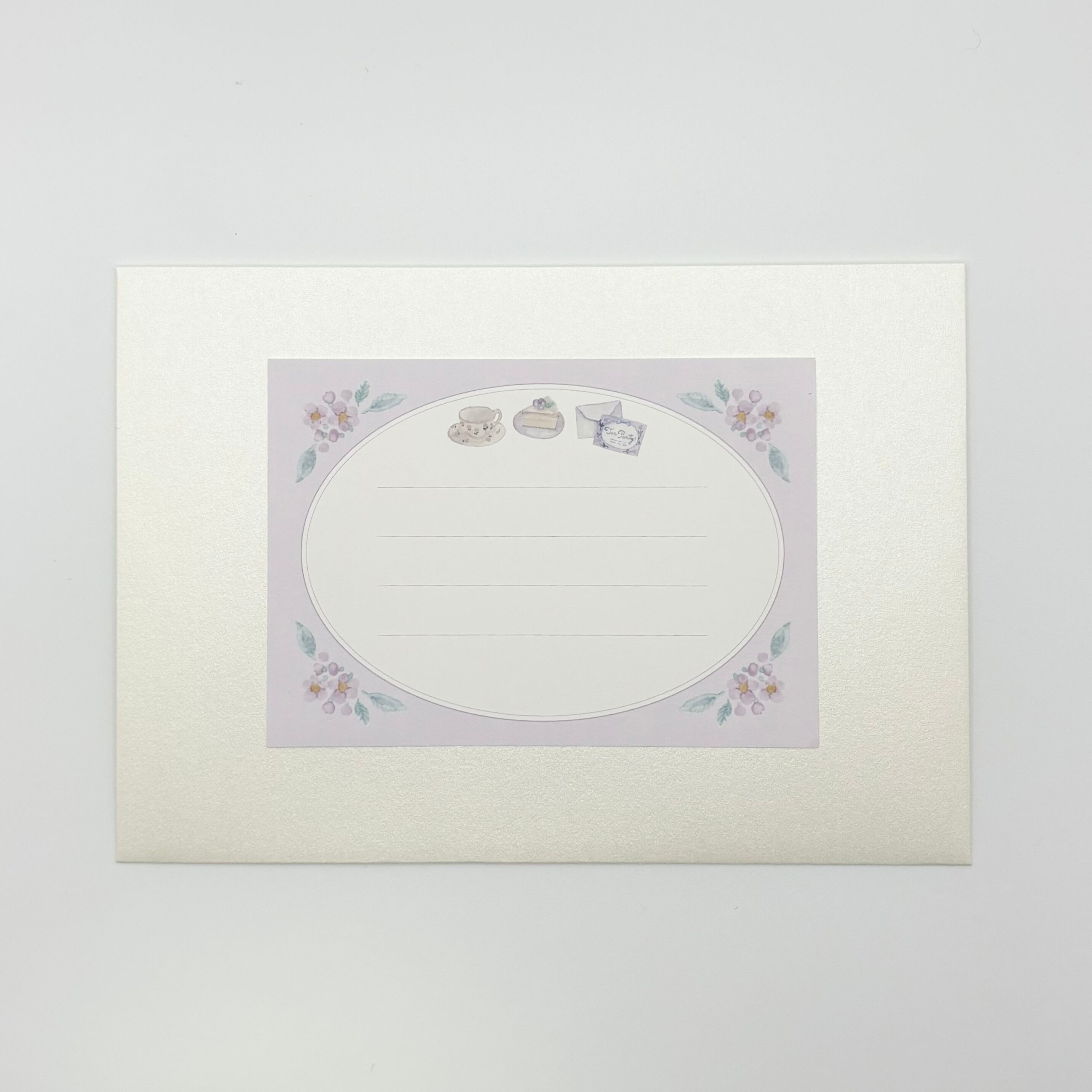 ねことすみれのレターセットは、愛らしい猫がすみれ色のアイテムたちと一緒に描かれた、素敵なセットです。